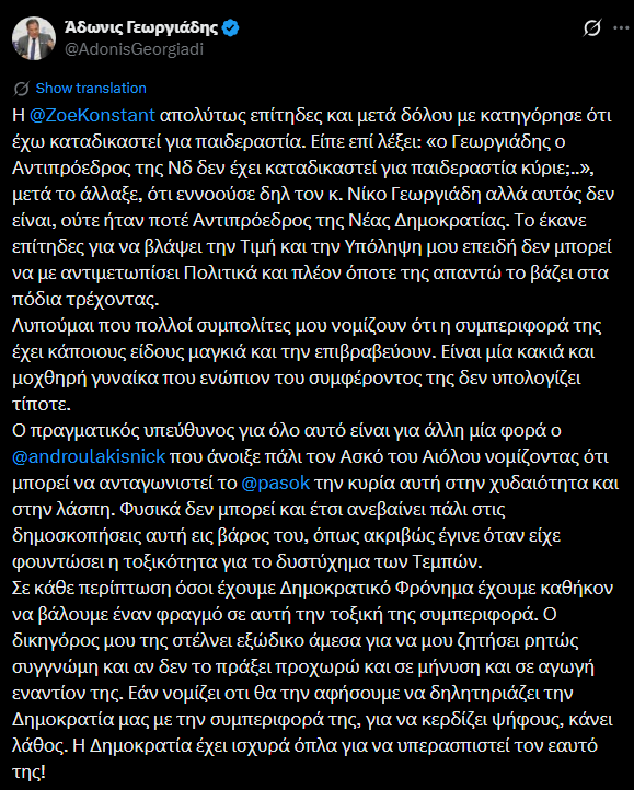 «Η Ζωή Κωνσταντοπούλου απολύτως επίτηδες και μετά δόλου με κατηγόρησε ότι έχω καταδικαστεί για παιδεραστία. Είπε επί λέξει: «ο Γεωργιάδης ο Αντιπρόεδρος της ΝΔ δεν έχει καταδικαστεί για παιδεραστία κύριε;..», μετά το άλλαξε, ότι εννοούσε δηλαδή τον κ. Νίκο Γεωργιάδη, αλλά αυτός δεν είναι, ούτε ήταν ποτέ Αντιπρόεδρος της Νέας Δημοκρατίας. Το έκανε επίτηδες για να βλάψει την Τιμή και την Υπόληψή μου επειδή δεν μπορεί να με αντιμετωπίσει Πολιτικά και πλέον όποτε της απαντώ το βάζει στα πόδια τρέχοντας.